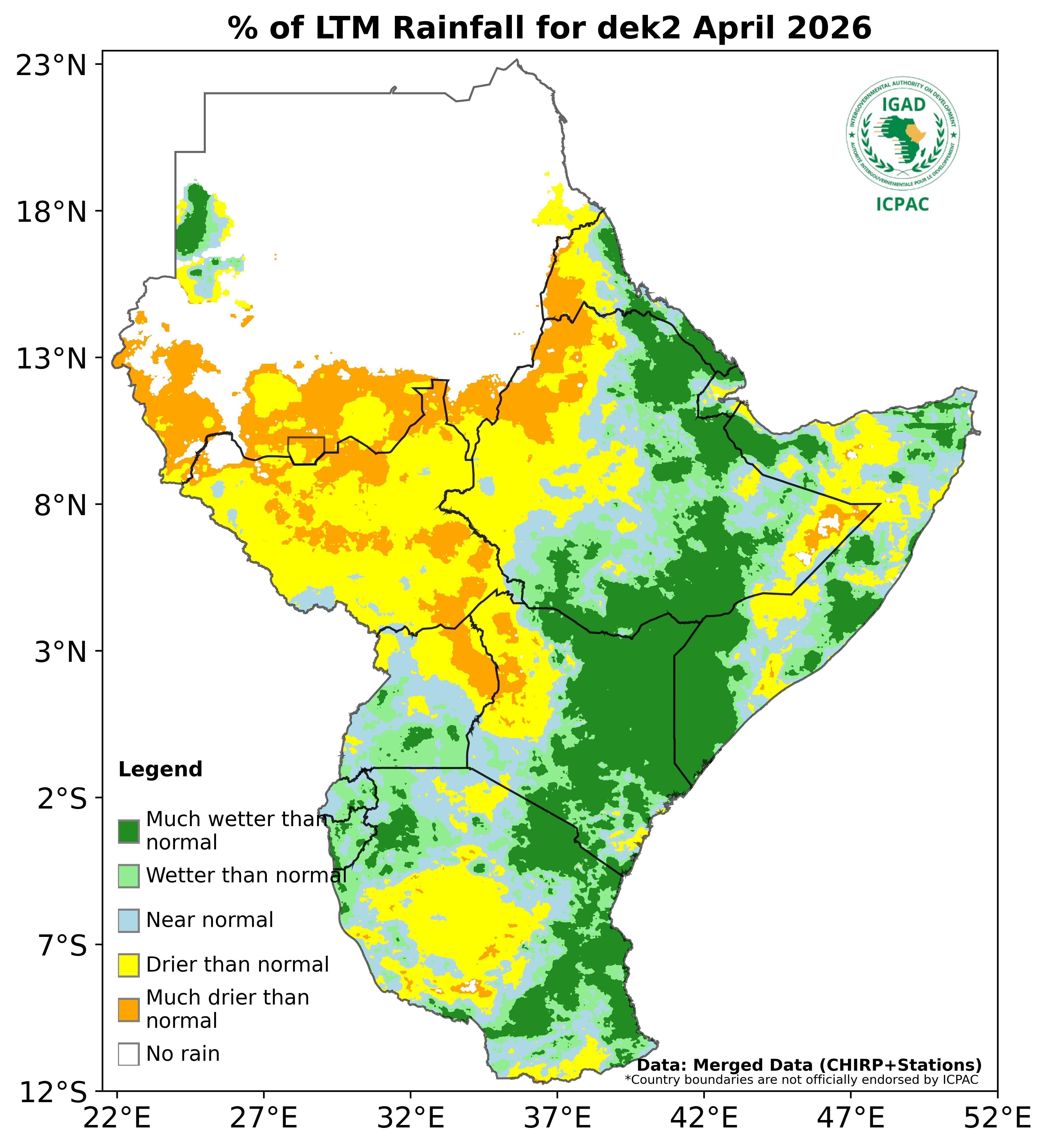 - Much wetter than Normal: This category was observed in the eastern and northwestern parts of Tanzania, southern parts of Uganda, eastern parts of Kenya, southern, central and northern Ethiopia, Eritrea, Djibouti and southern Somalia.