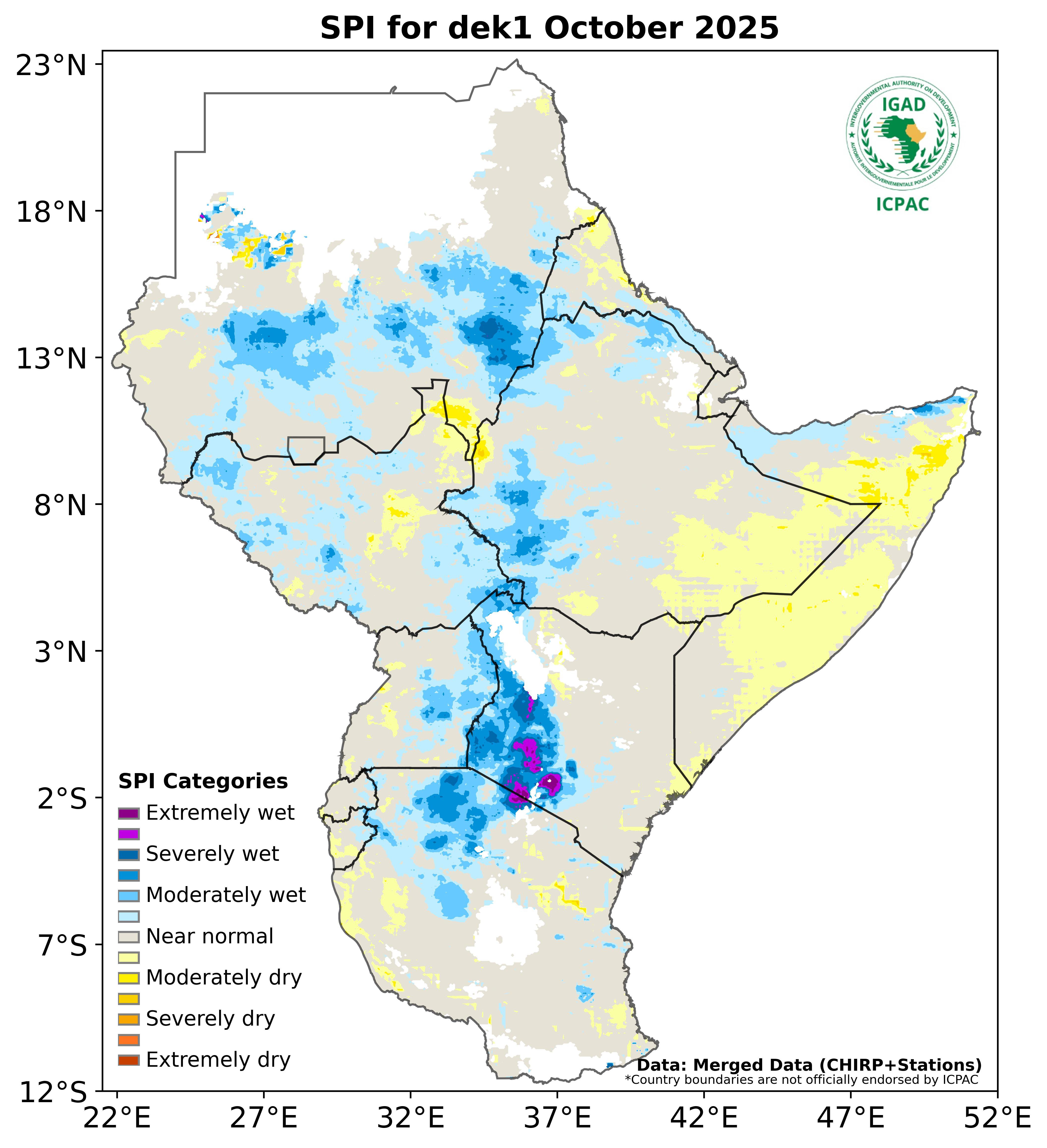A large area stretching across the northern and central parts of the region was characterized by moderately to severely wet conditions. These areas include central Sudan, western Eritrea, south and northwestern Ethiopia, and northern Somalia, western and southeastern South Sudan, western parts of Kenya and northwestern parts of Tanzania.