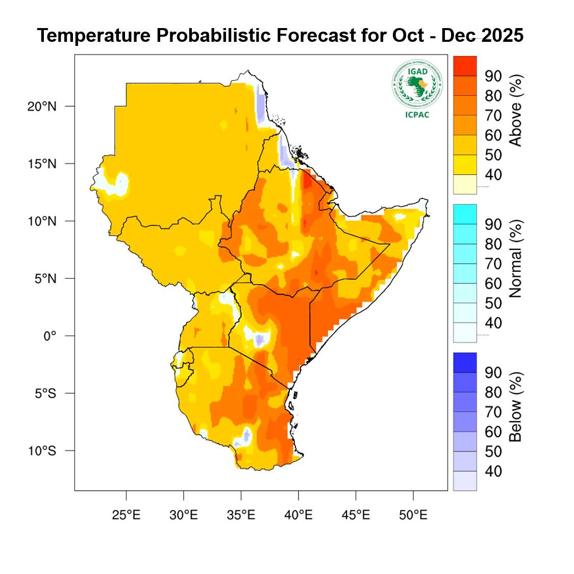 - Warmer than usual temperatures expected all over the region with highest probabilities over Sudan, Eritrea, Djibouti, western South Sudan, south-western Ethiopia, much of Kenya, and eastern Tanzania.