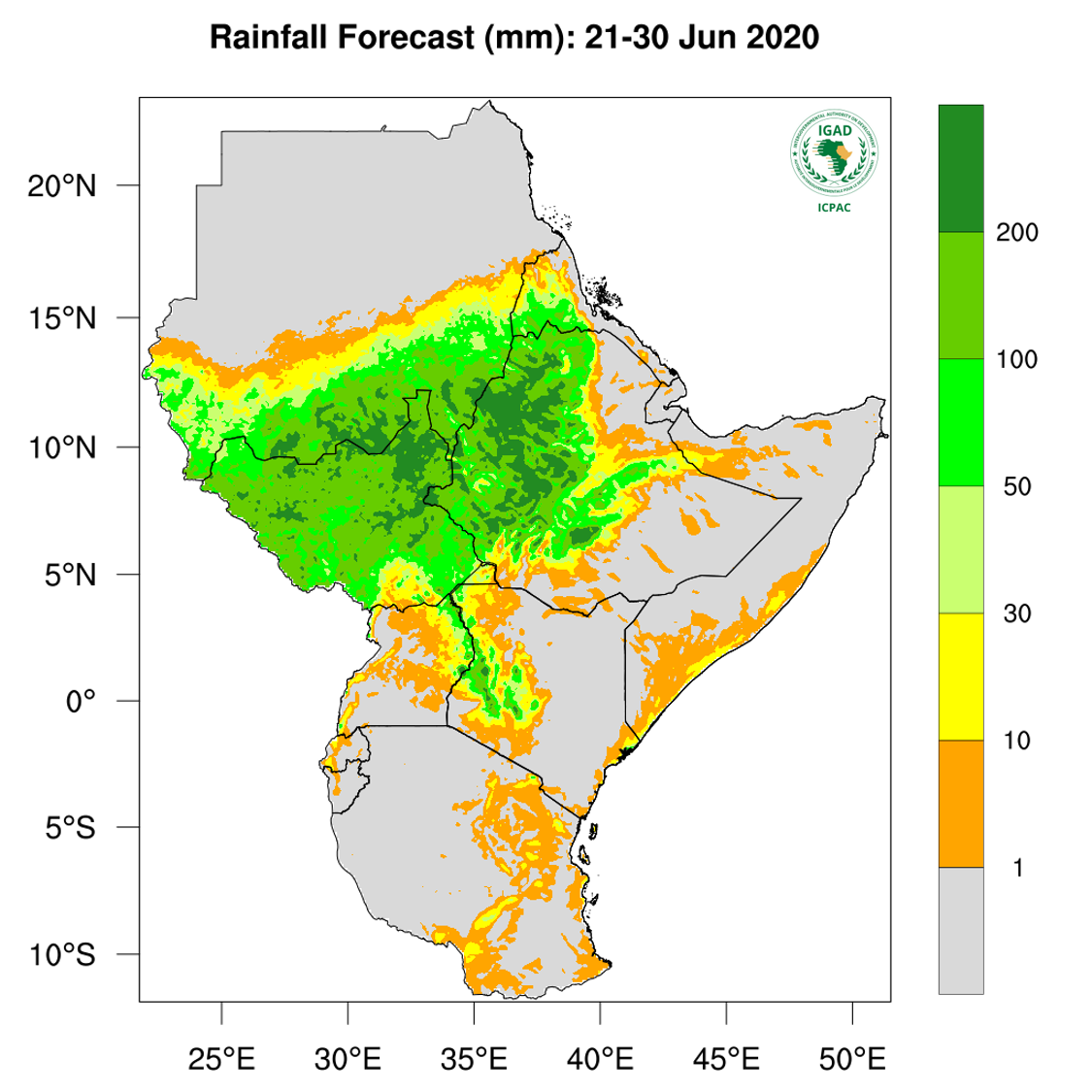 - Heavy to moderate rainfall in the range 50-200 mm forecasted in much of South Sudan, much of southern parts of Sudan, much of central, western, and northern Ethiopia extending to Eritrean border, and parts of central and western Kenyan border.