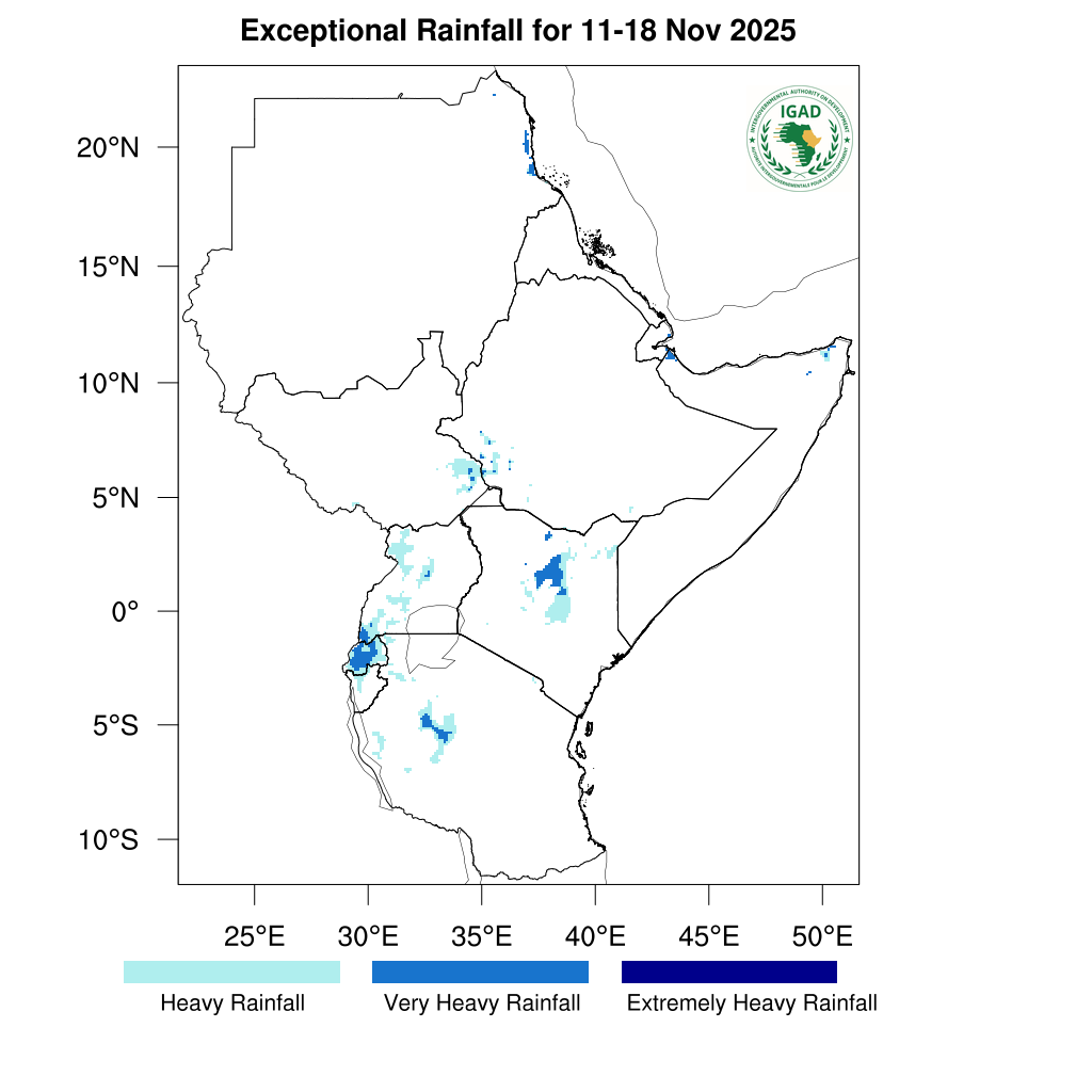 - Light rainfall (less than 50 mm) expected over central South Sudan, south-western Uganda, northern and eastern Tanzania, central to eastern Kenya, southern Ethiopia and most parts of Somalia.