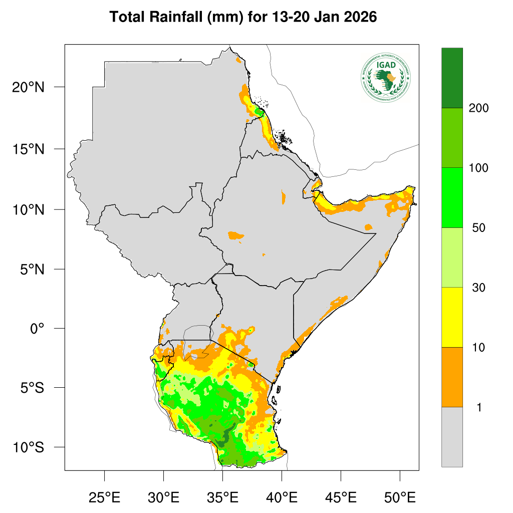 - Light rainfall (less than 50 mm) expected over most parts of Rwanda, northern Burundi, southern Kenya, northern coastal areas of Somalia, parts of coastal eastern Sudan, coastal eastern Eritrea and northern and western Tanzania.