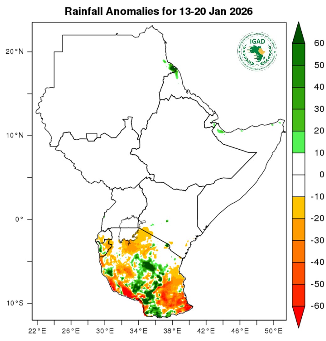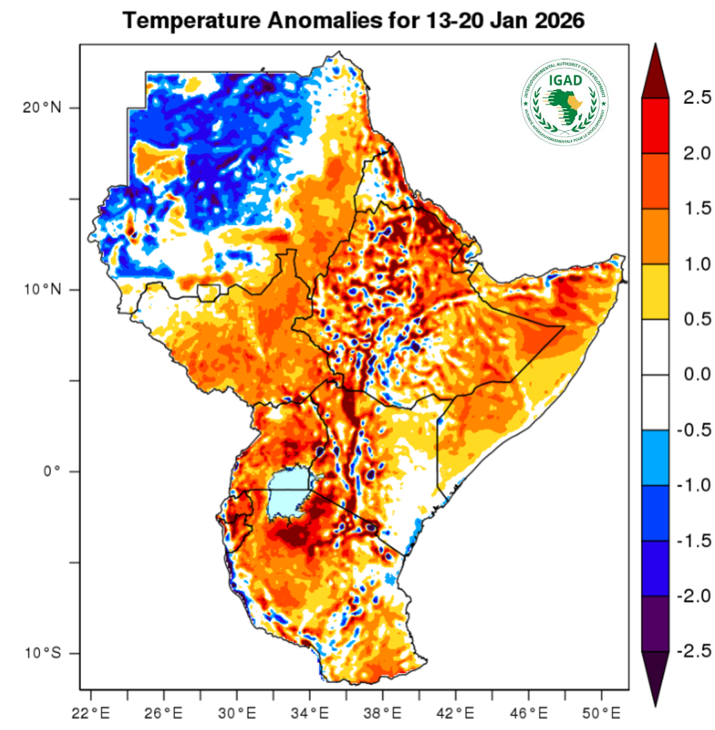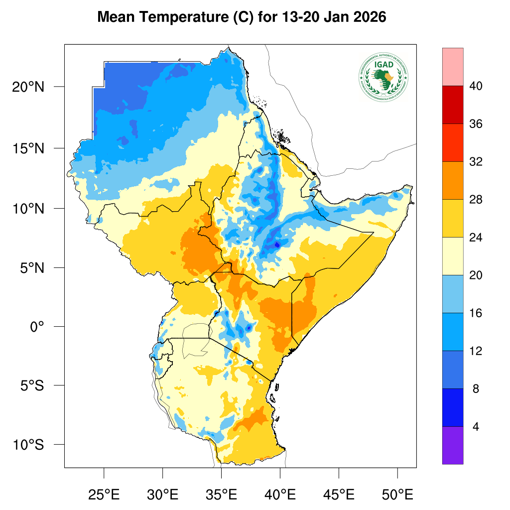 - Moderate to high temperatures (20-32℃) expected over most parts of Tanzania, Kenya, Uganda, Somalia, South Sudan and eastern and southern regions of Sudan.