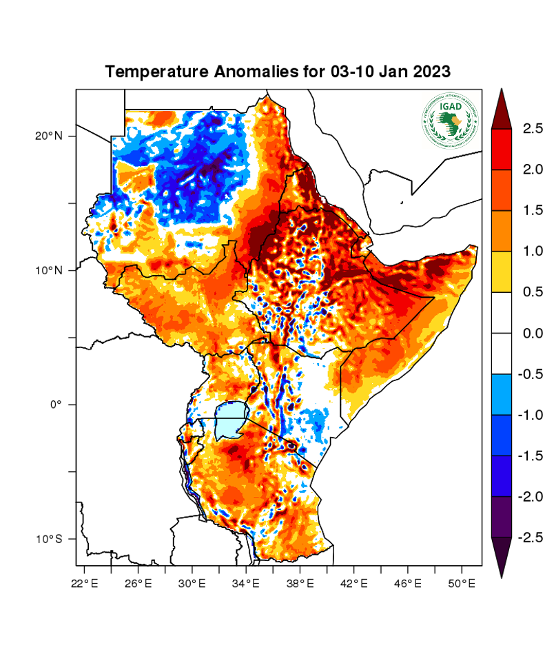 - Moderate temperatures (20 - 32 ℃) expected over southern parts of Sudan, South Sudan, central to northern Uganda, Tanzania, northern and eastern Kenya, and most parts of Somalia, Djibouti, south-eastern and north-eastern Ethiopia, and western and coastal parts of Eritrea.