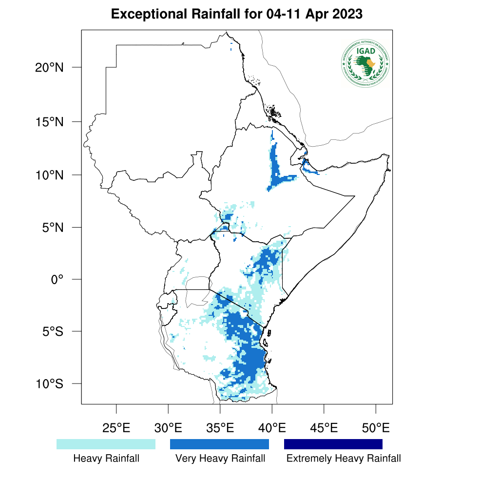 - Heavy to very heavy rainfall (top 10%-5%) rainfall expected over north-eastern and south-western parts of Ethiopia, parts of eastern Kenya, as well as southern and eastern Tanzania.