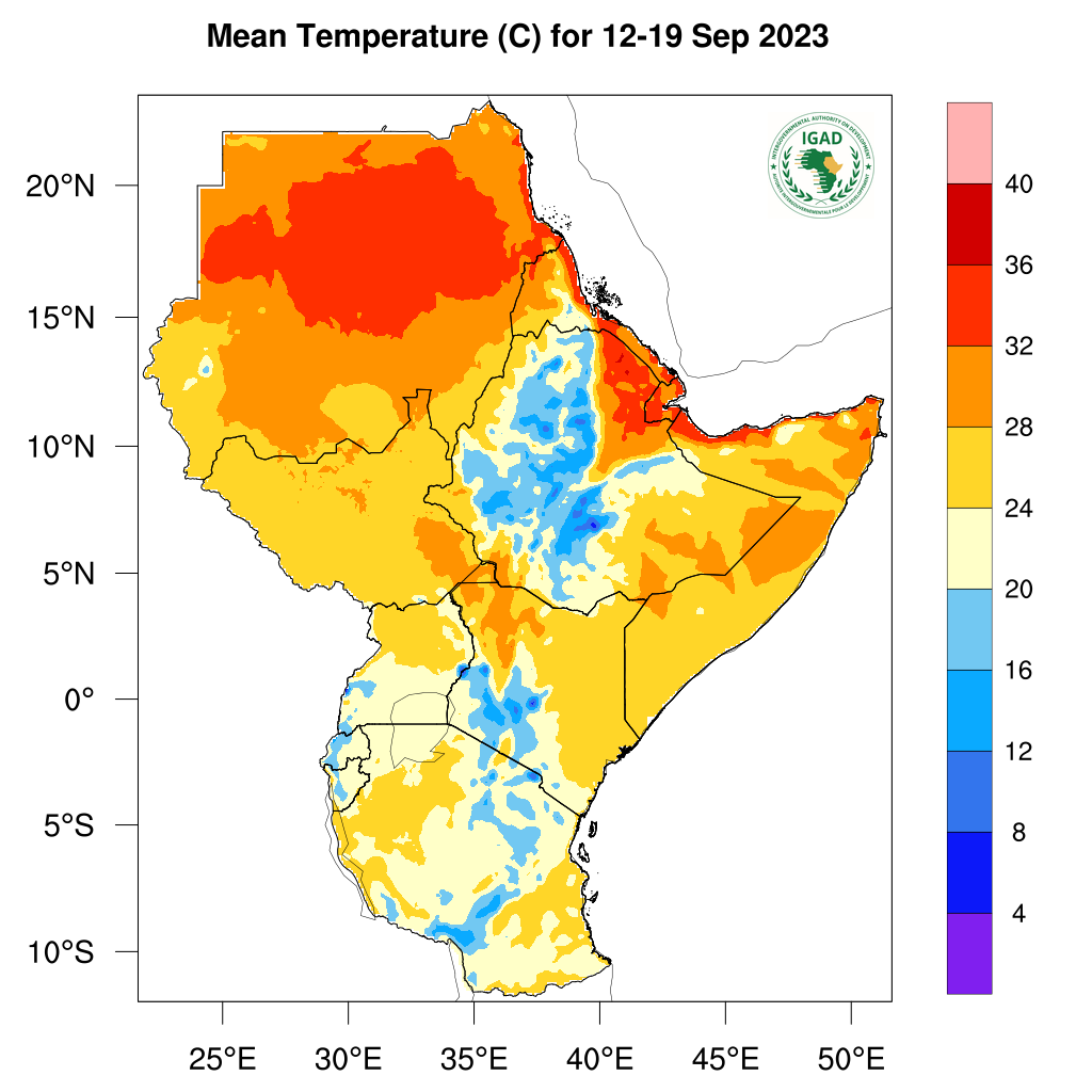 • Mild temperature conditions (less than 20℃) expected over central to western Ethiopia, central to western Kenya, western Rwanda and Burundi, and central parts of Tanzania.