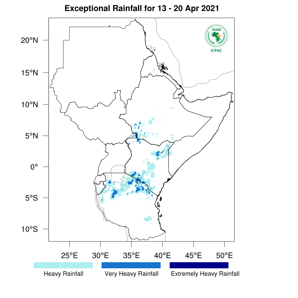 - Heavy to very heavy rainfall (top 10 to 5% on record) is expected in parts of south-western Kenya and Tanzania with weekly rainfall between 100 - 200 mm.