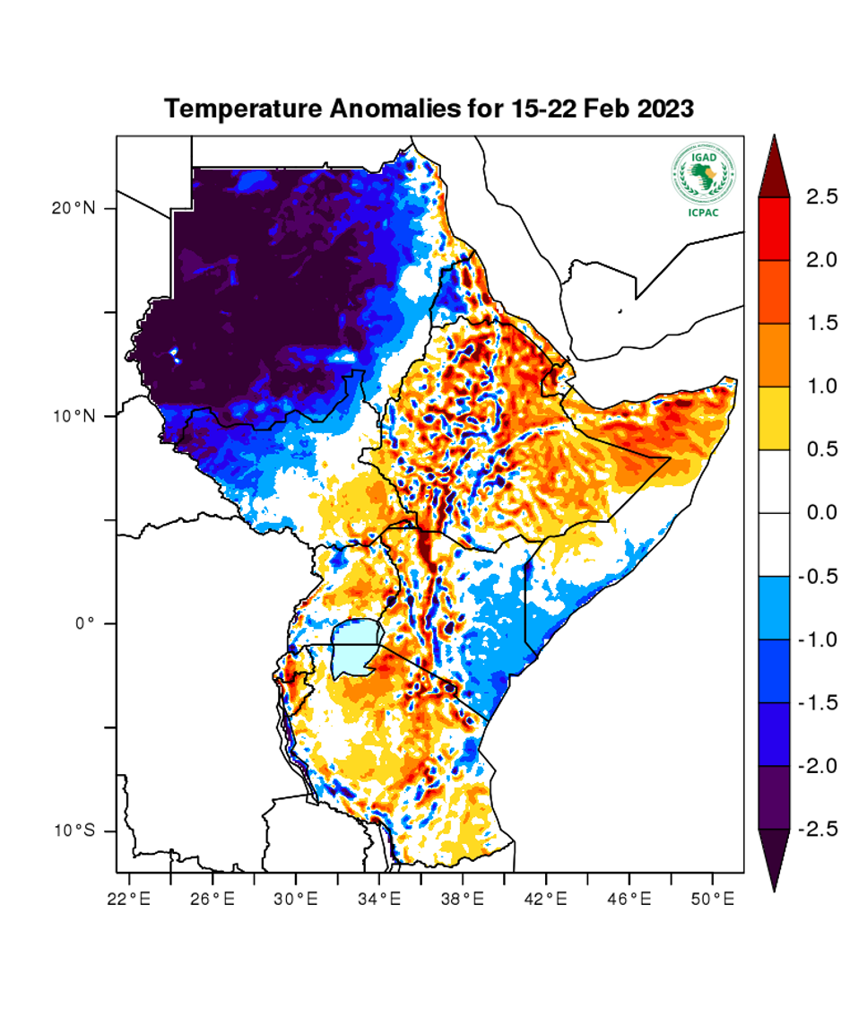 - Moderate to hot temperatures (20 - 32 ℃) expected over most parts of southern Sudan, South Sudan, Eritrea, Djibouti, Somalia, northern and eastern Kenya, Uganda, Tanzania, Rwanda, and Burundi.