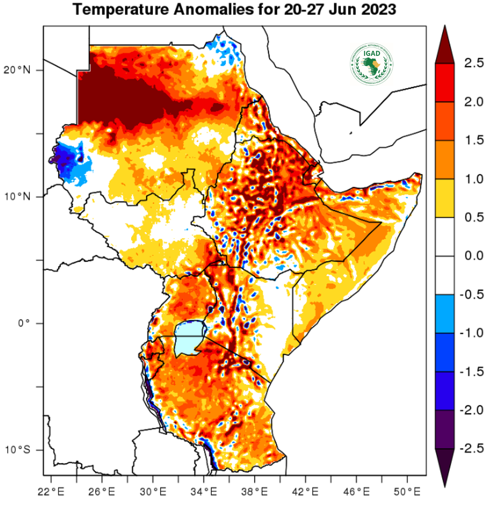 - Hot temperatures (above 32 ℃) expected over central to northern Sudan, Afar region in Ethiopia, Djibouti, coastal regions of Eritrea, and north-western coastal parts of Somalia.