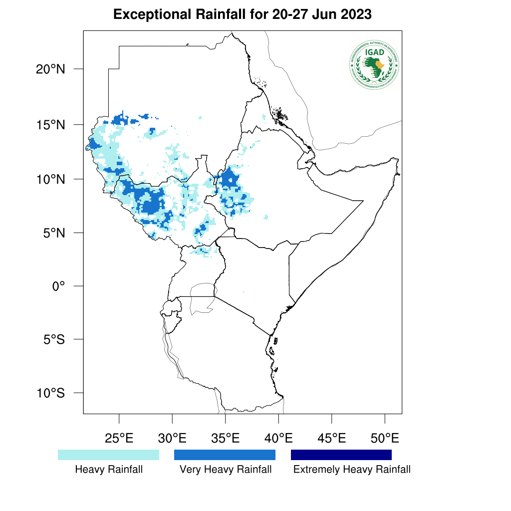 - Heavy to very heavy rainfall (top 10%-5%) expected in western and isolated areas of southern Sudan, much of South Sudan, western Ethiopia, and isolated areas in northern Uganda.