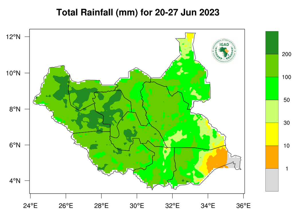 • Heavy rainfall (greater than 200mm) expected over isolated areas in western parts of South Sudan.