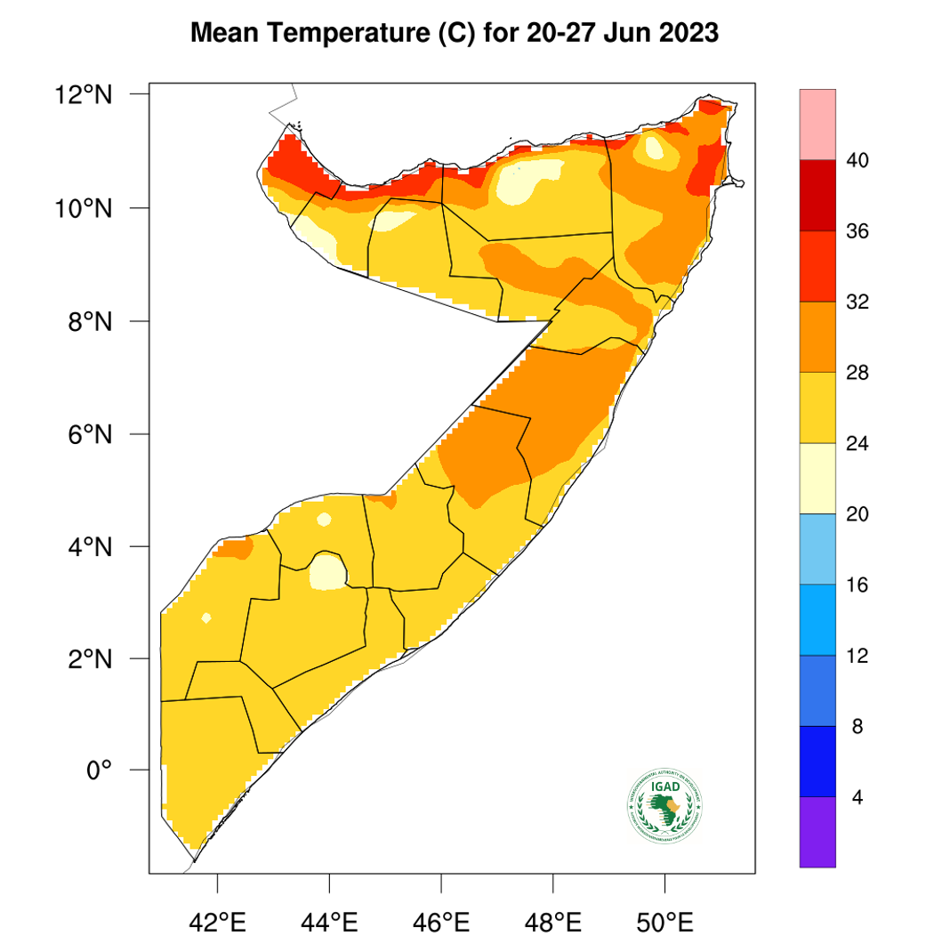 - Hot temperatures (greater than 32℃) expected over isolated areas in the northern parts of Somalia