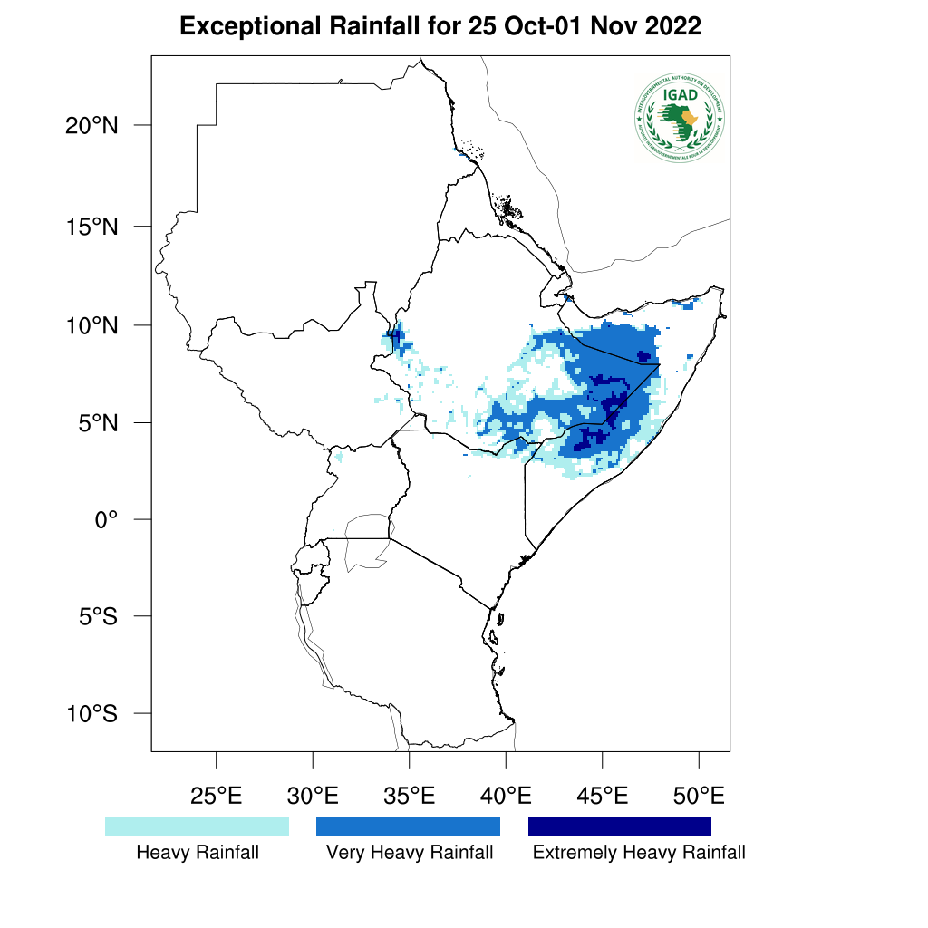 - Heavy to very heavy (top 10-5%) rainfall expected over parts of central to northern Somalia, and eastern Ethiopia.