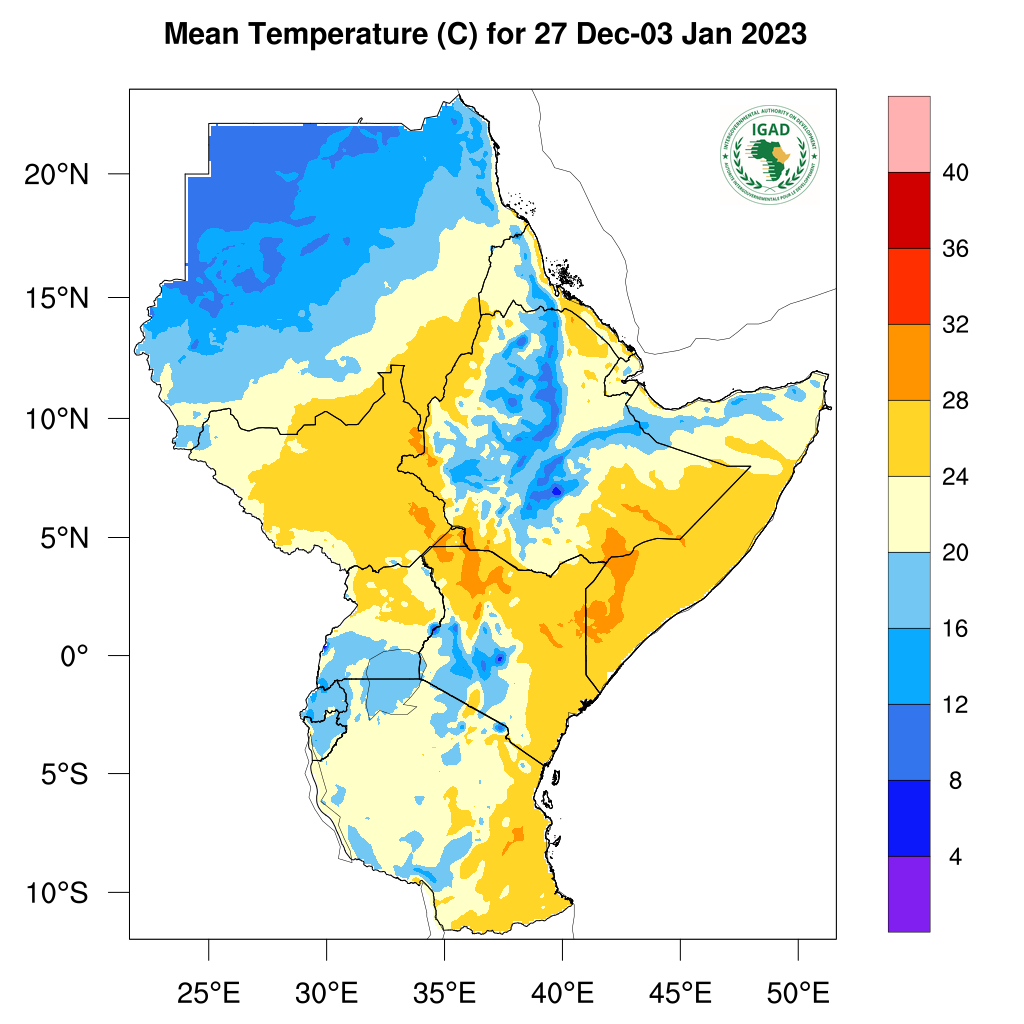 - Moderate temperatures (20 - 32 ℃) expected over southern and eastern parts of Sudan, South Sudan, south-eastern and north-eastern Ethiopia, Eritrea, Djibouti, Somalia, northern and eastern Kenya, central to northern Uganda, and most parts of Tanzania.