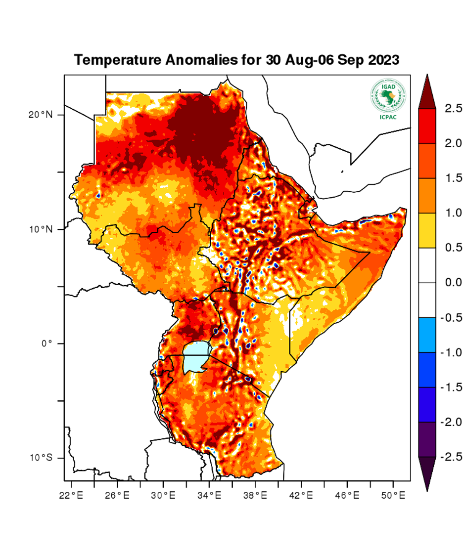 • Moderate to high temperatures (20-32℃) expected over central to southern Sudan, South Sudan, Uganda, eastern and northern Kenya, Somalia, south-western Ethiopia, and western and southern Tanzania.