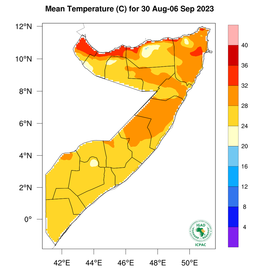 - Hot temperatures (above 32℃) expected over the northern coastal parts of Somalia.