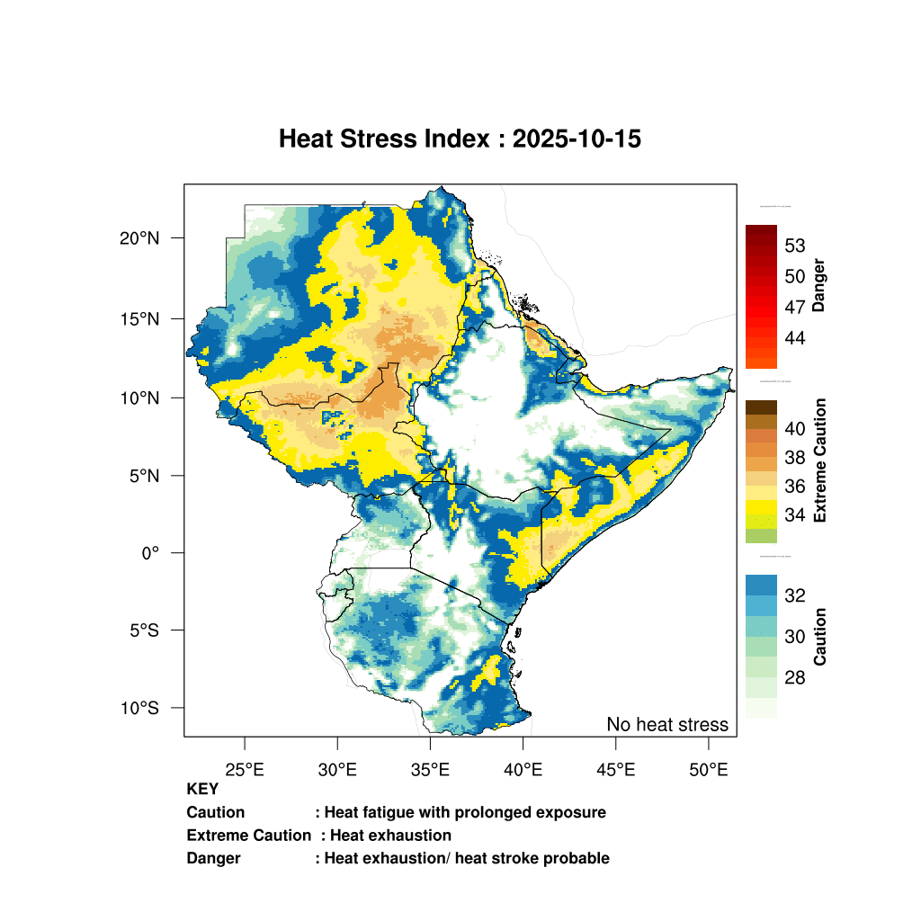 - Elevated heat stress levels expected in northern regions of South Sudan, eastern Sudan and Afar region in Ethiopia.