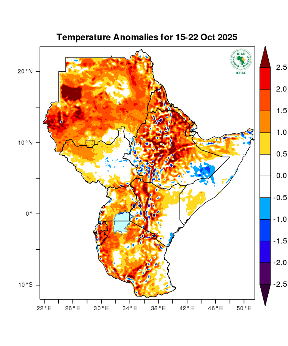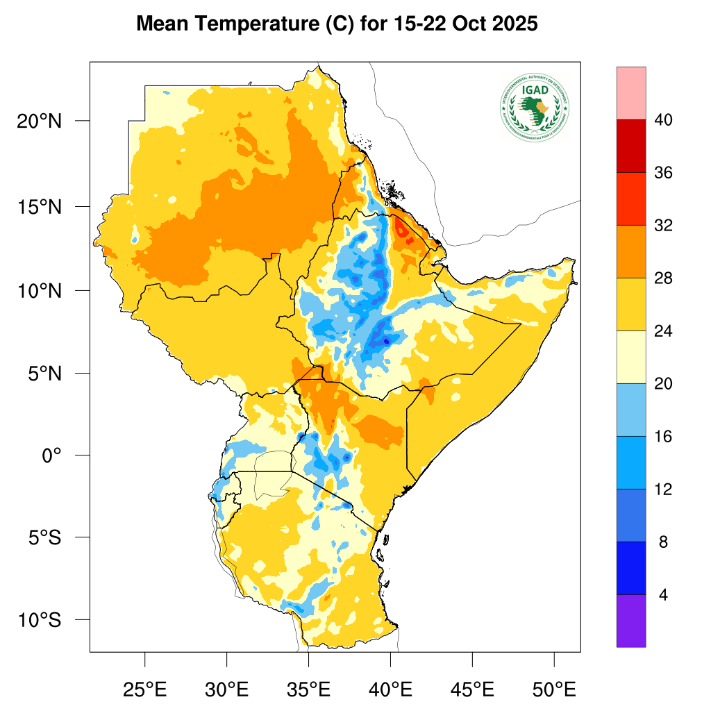 - Mild temperature conditions (less than 20℃) expected over central Ethiopia, central to south-western Kenya, and parts of western regions of Burundi, Rwanda, and Uganda.