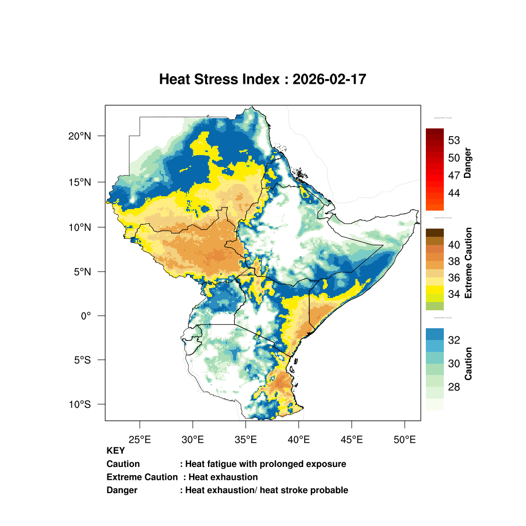 - Elevated heat stress in “Extreme Caution” category expected over eastern Tanzania, eastern South Sudan and eastern Kenya into southern Somalia.